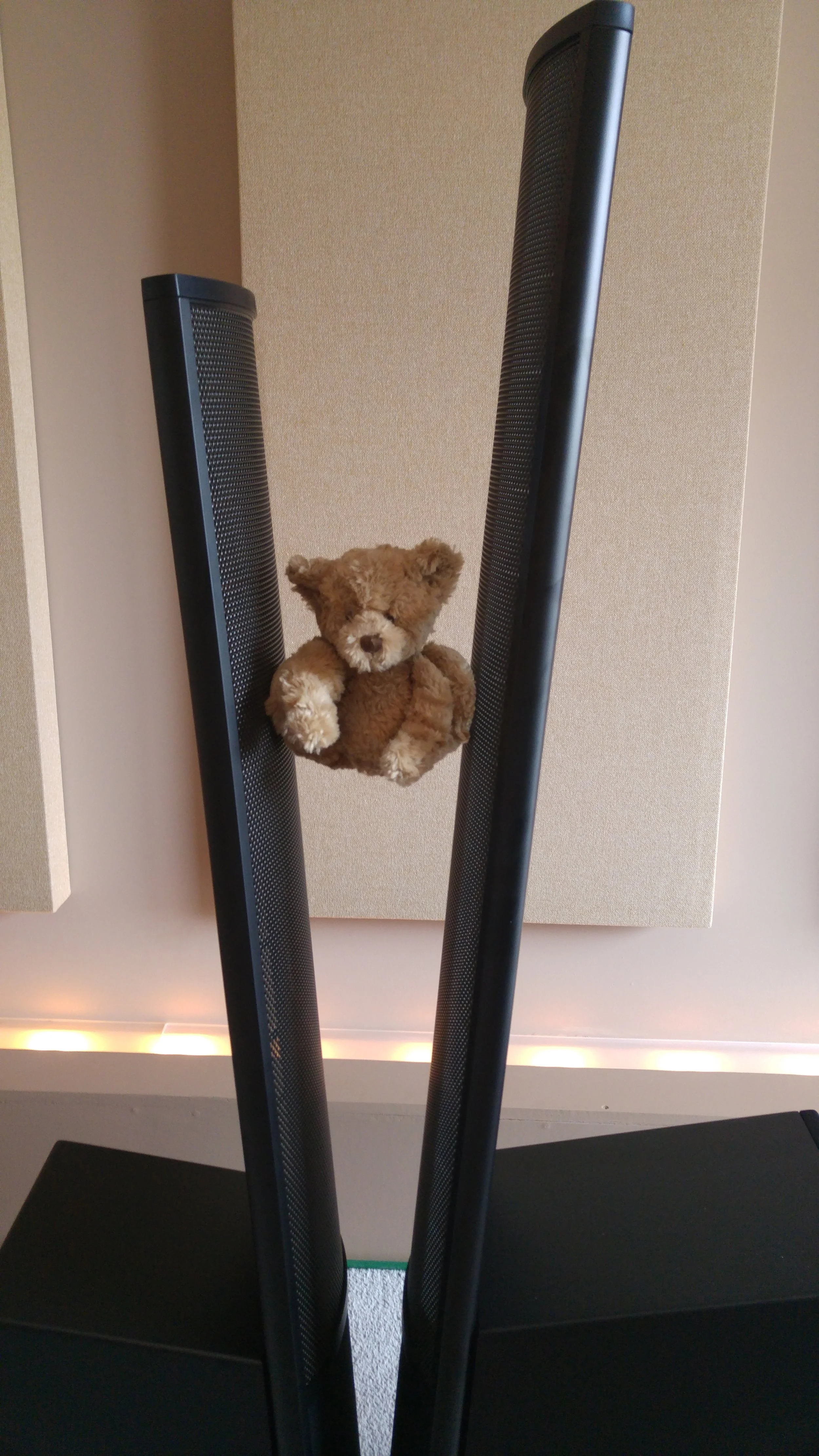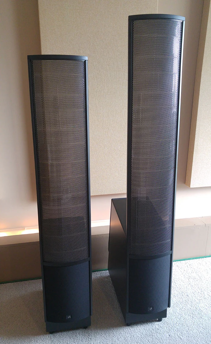 On the right is the Martin Logan Electromotion X which has a bigger electrostatic panel for wider range, and two bass drivers mounted fore and aft, it also has bi-wire terminals.