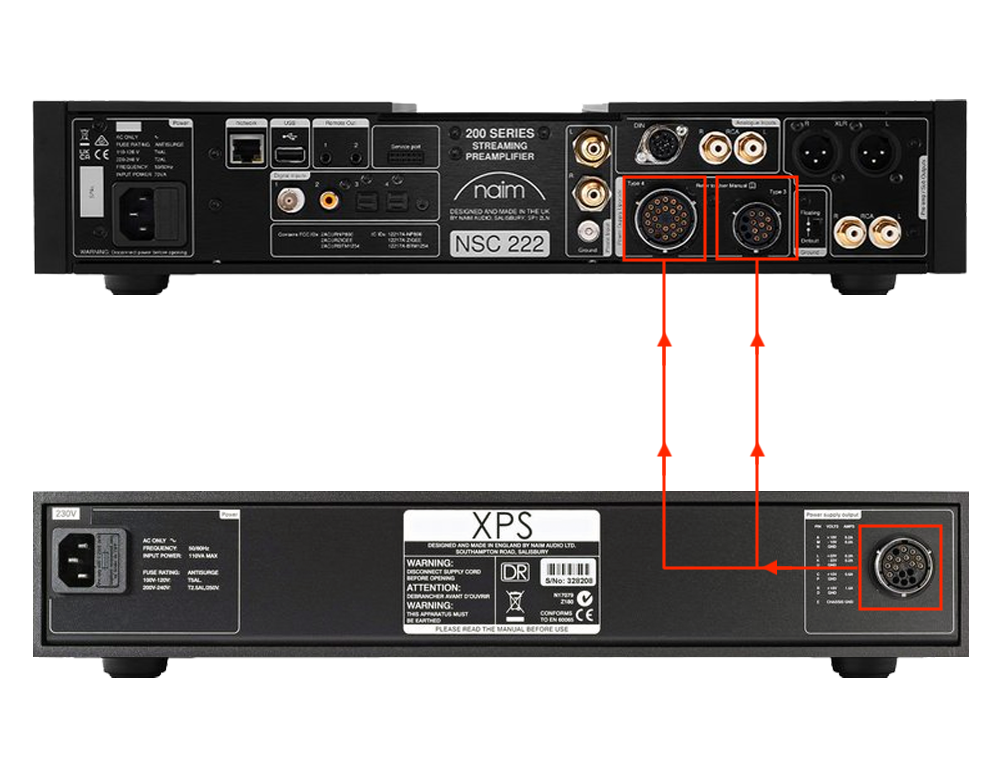 The NSC 222 is also compatible with the older Naim XPS/DR Power Supply upgrade using a 19 way single Burndy Cable from the Naim XPS/DR power output to a 12 and 23 way Burndy cable to the power input of the NSC 222 (See below).