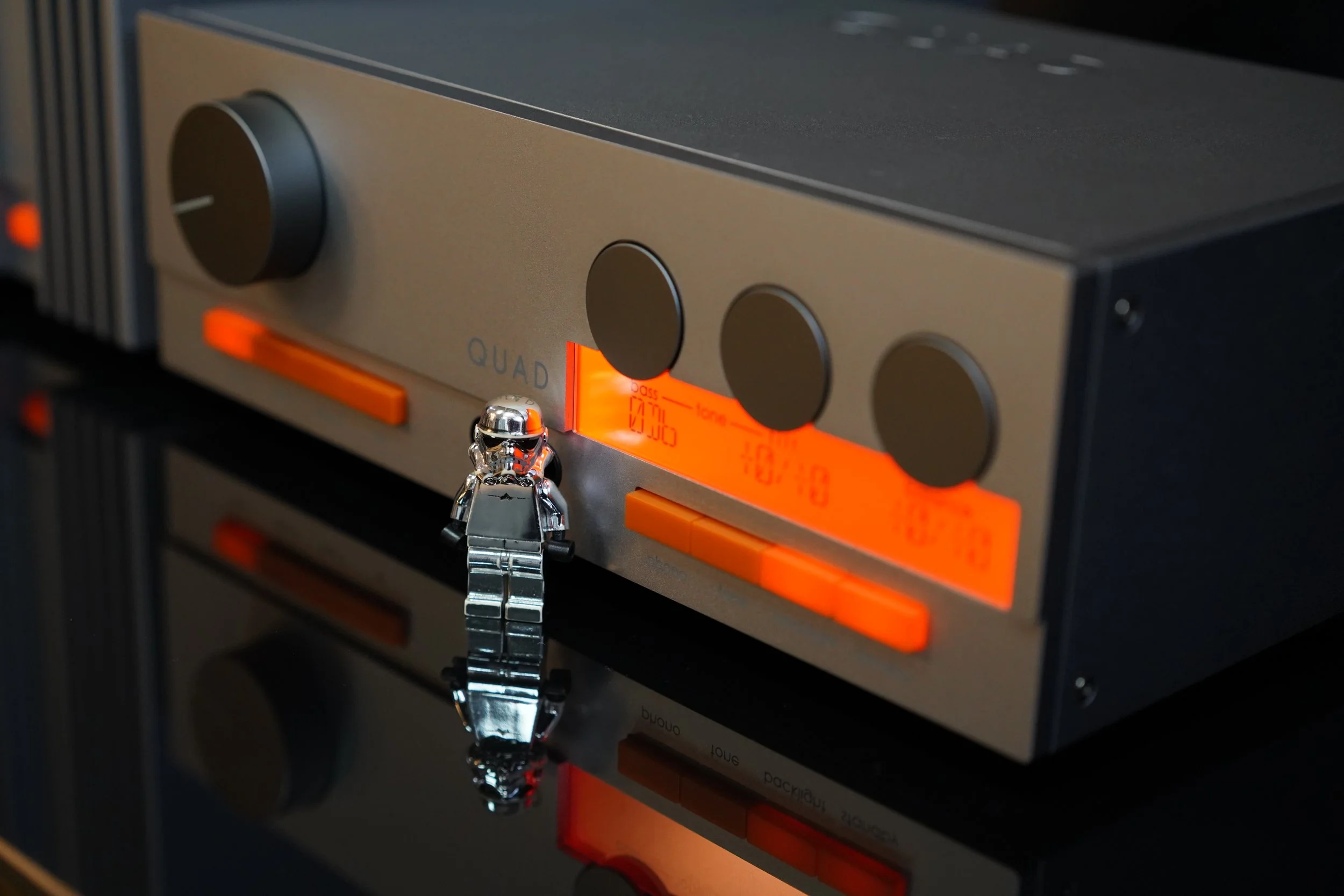 The original Quad 33 is visually iconic, with its compact, cube-like chassis and distinctive silver and orange finish. It embodies the minimalist, functional aesthetic of the 1960s, emphasizing ease of use and modularity.