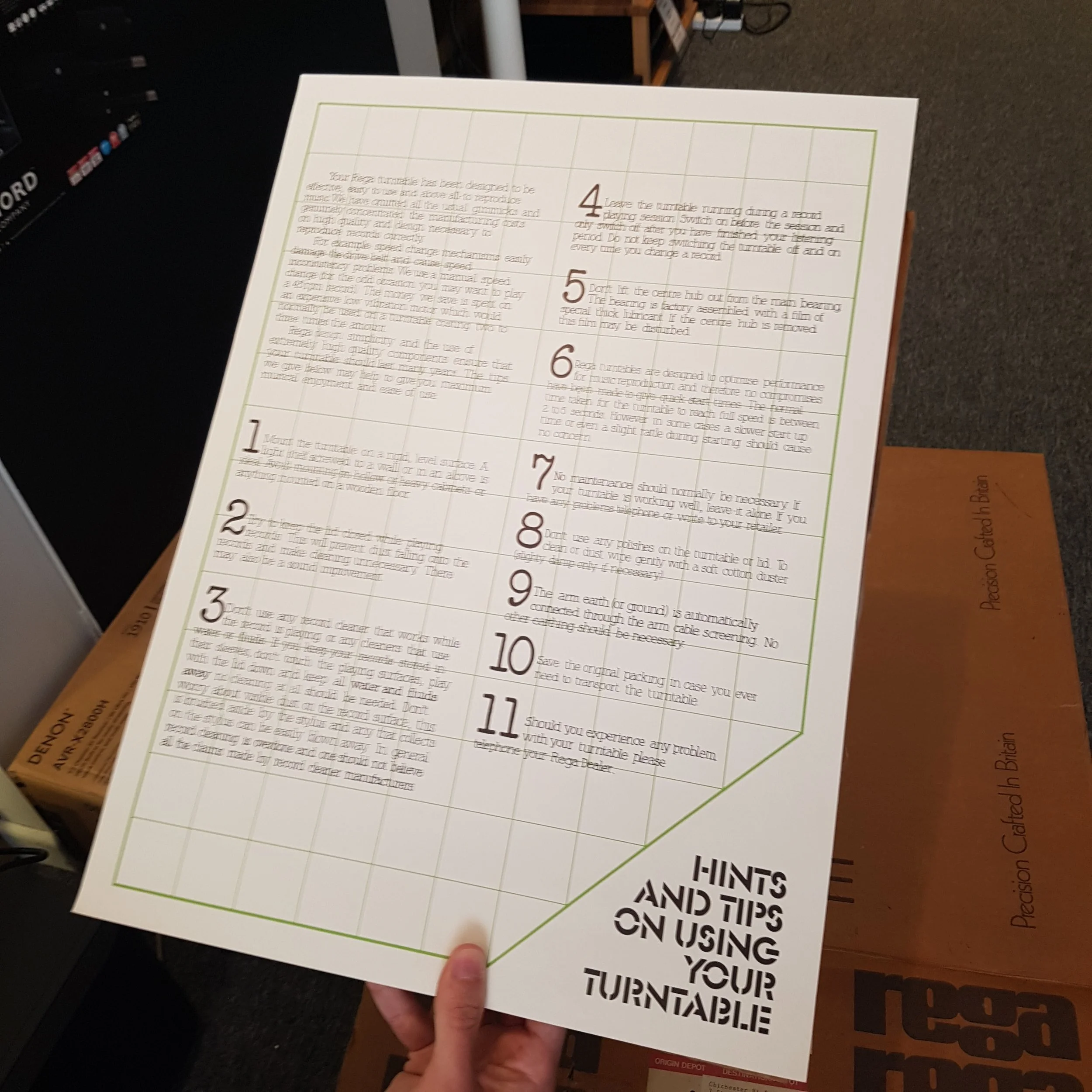 Everything was neatly packed and wrapped as it would have been the day it left the former Chichester High Fidelity shop. There was even the old Rega hints and tips sheet in the box that they used to send with every turntable. Rega tell us that they stopped issuing hints and tips sheets in the early 2000s!