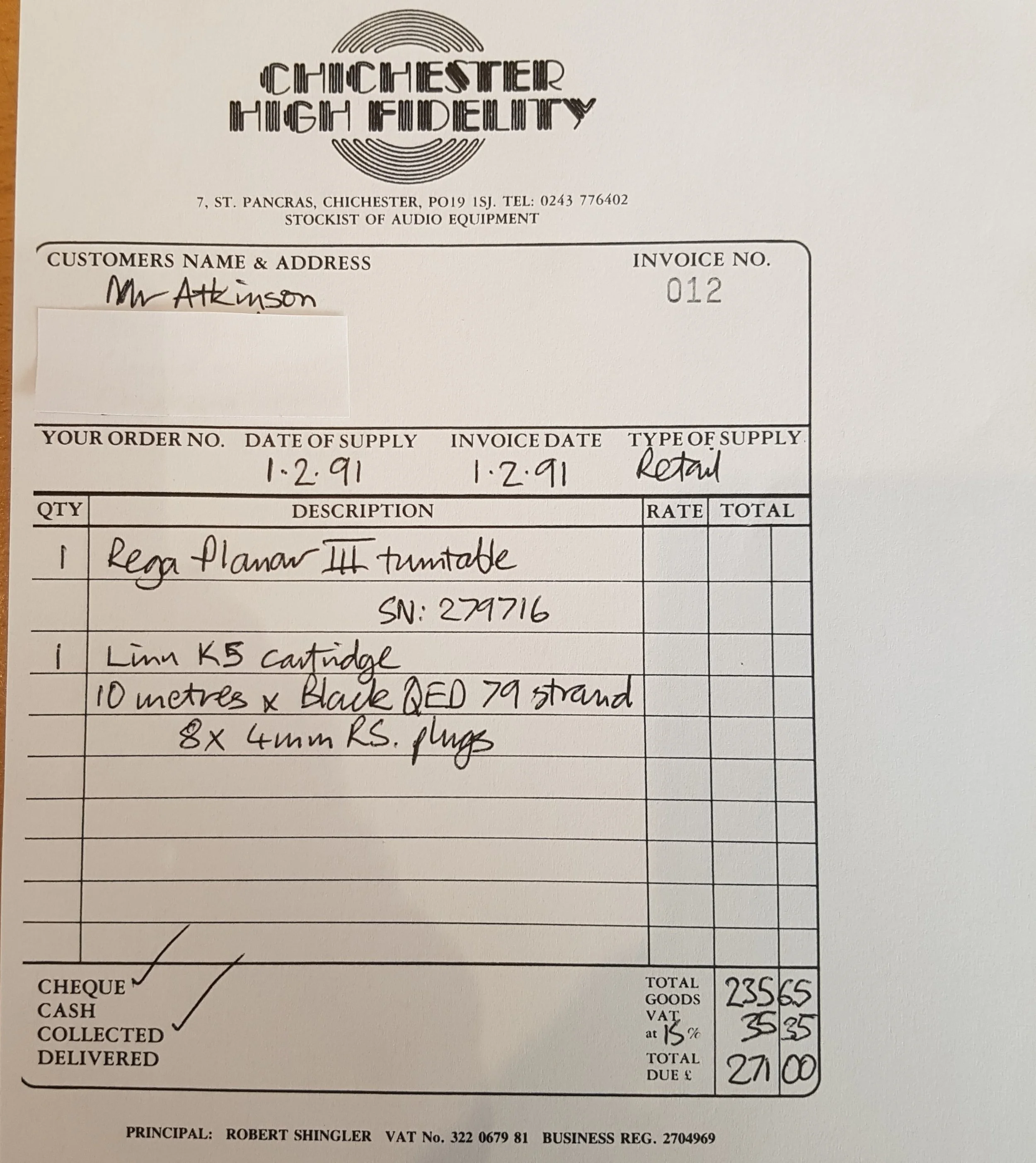 Philip kindly shared the original receipt from Chichester High Fidelity with us. Those of you who recently bought new hi-fi may want to look away now. The total cost was £271, including a Linn K5 cartridge, 10 metres of QED cable (terminated with banana plugs) and only 15% VAT!