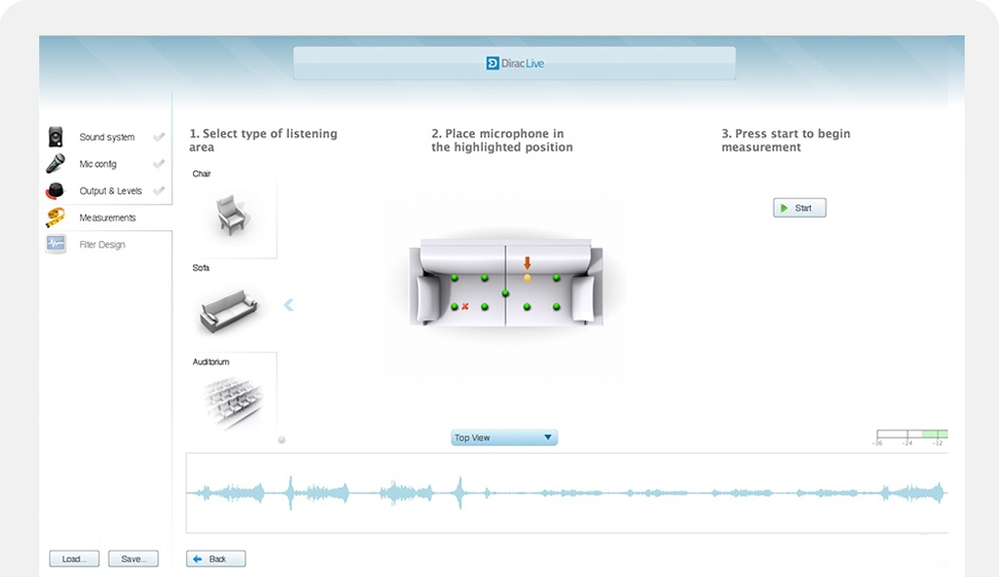 Using a microphone, laptop and network access, each of the speakers are measured from 9 different test microphone positions. This way, a clear map of the room and the speaker's acoustic behaviour is built up.  The whole process can take a while dependent on the complexity of your system. After these measurements are taken, the results are processed very quickly and remotely (via the web to Dirac HQ in Sweden) and received back ready to be applied. This file is then uploaded to the Arcam  AVR550 or AVR850 and you're ready to listen.
