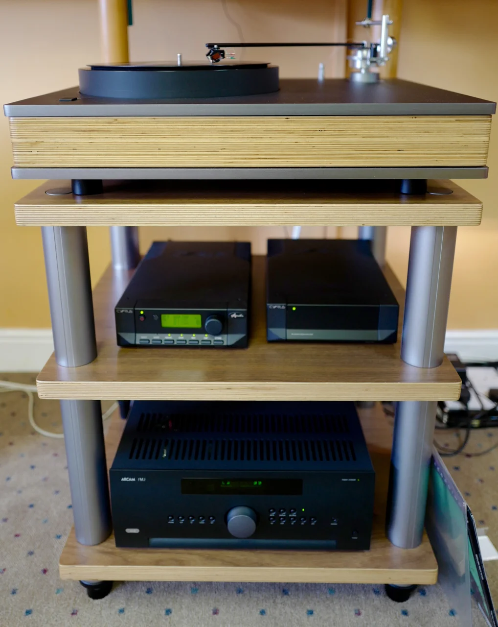 Naturally with an arm so long a larger plinth is required and that is the very first thing anyone will notice when they clap eyes on the Royale 400, its size; 63.5x55.5cm. However, in practice, this is only a little larger than a Quadraspire SVT table (59.5x47.5cm) for example. However a custom built 3 tier table the exact size to match is also available. It too uses birch ply for the shelves and features anodised extruded aluminium columns inside which is a one inch diameter steel rod running the entire height of the table and threaded at both ends to facilitate a compression method of tightening. It’s extremely rigid.